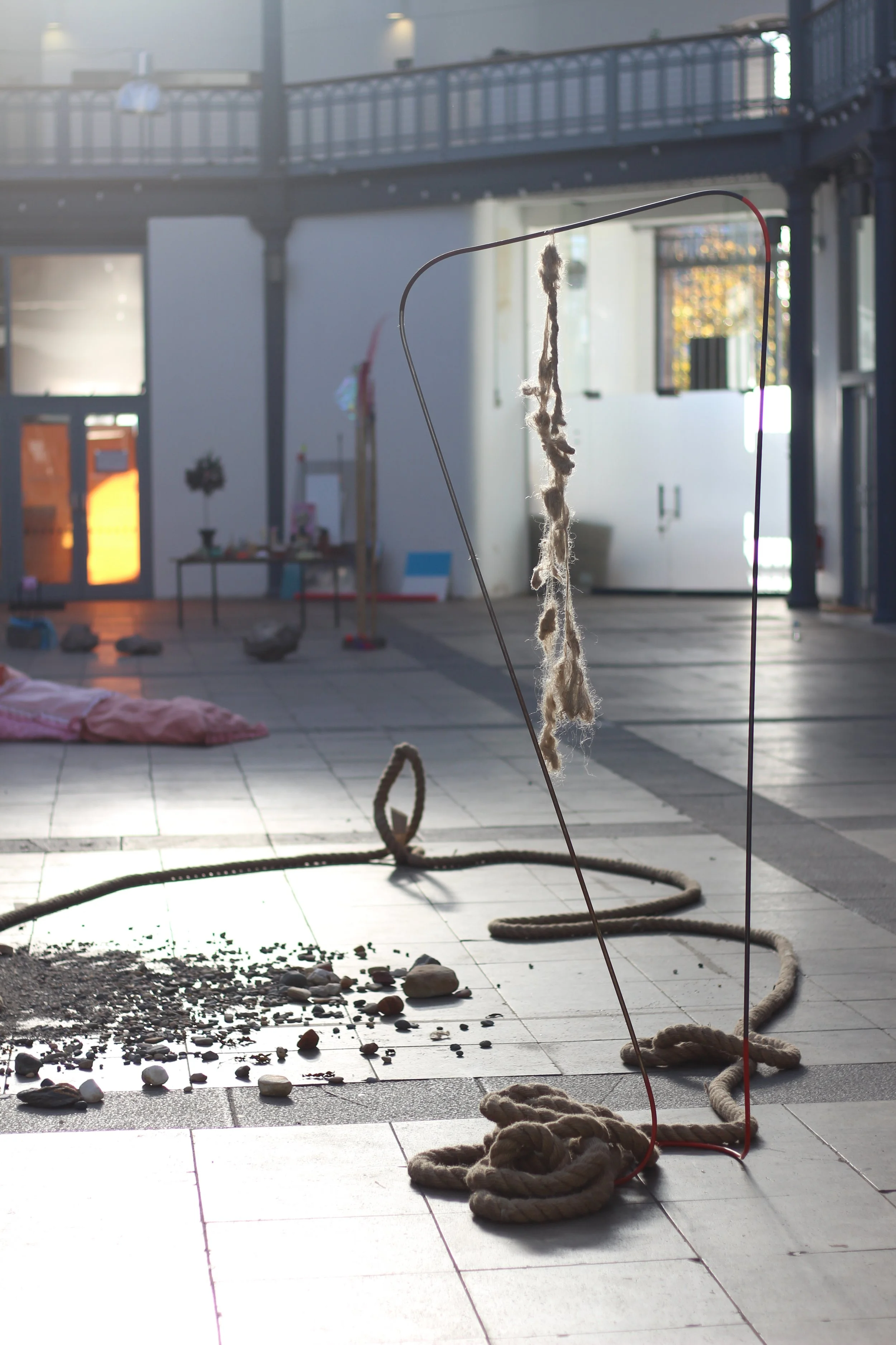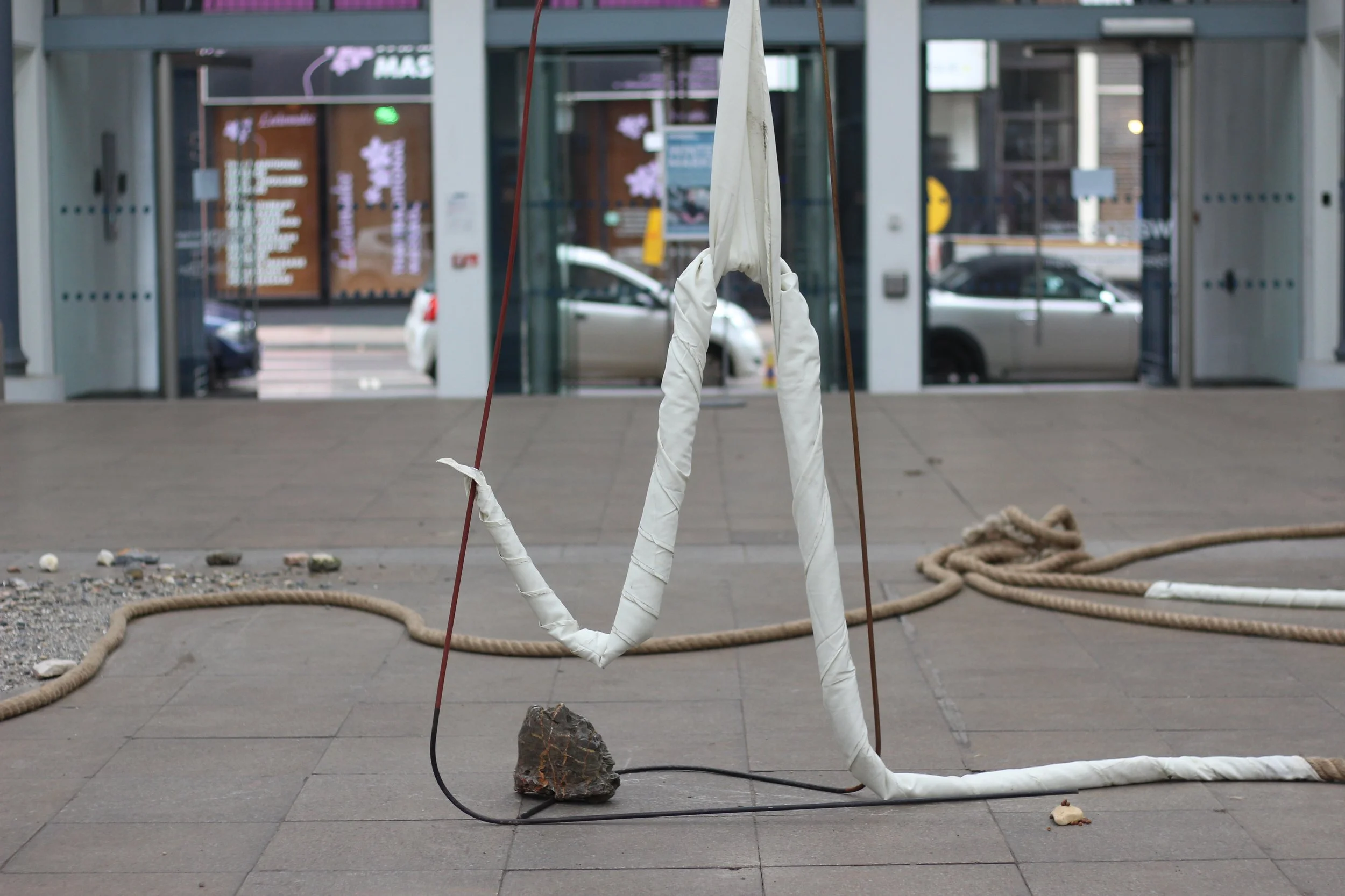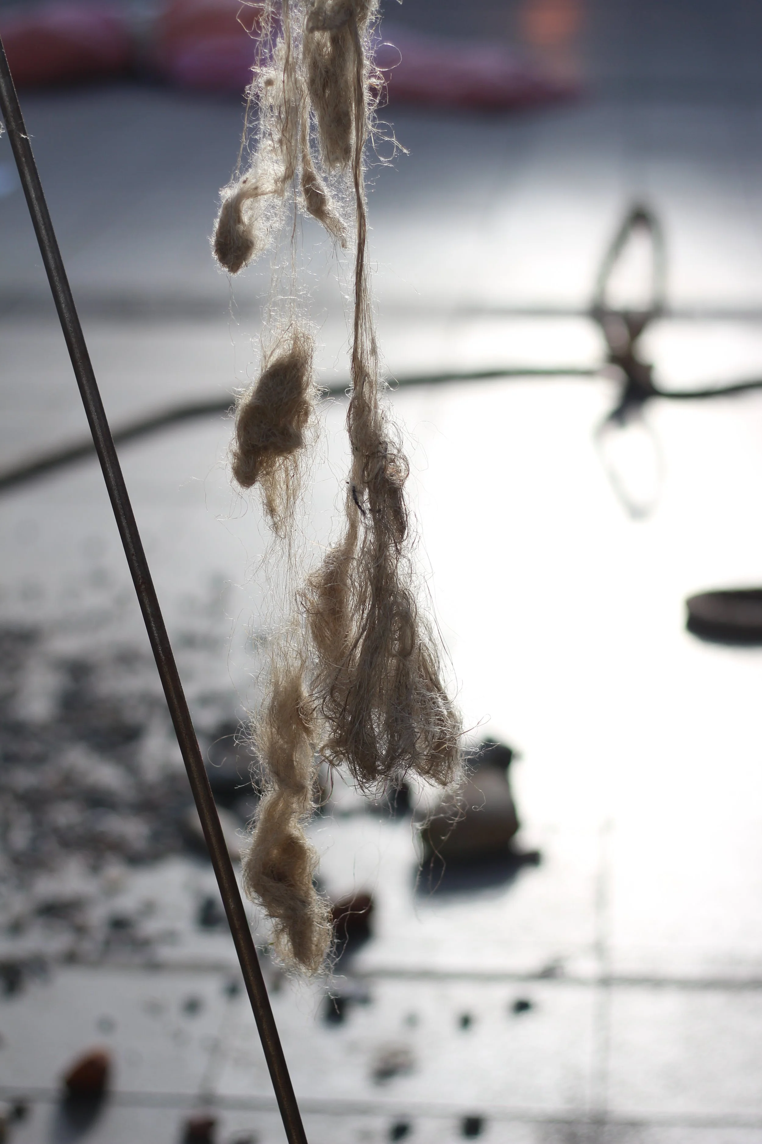 During the creation of this piece, I concentrated on performing physical actions and tasks that allowed me to forge a deeper connection with my ancestors. On the residency, I collaborated with the crew to manoeuvre various ropes that controlled the sails, adjusting our speed and direction in response to the wind and sea. These continuous physical motions inspired the installation, which aims to capture the vastness and ever-changing nature of space and time through raw materials, audio, and air.